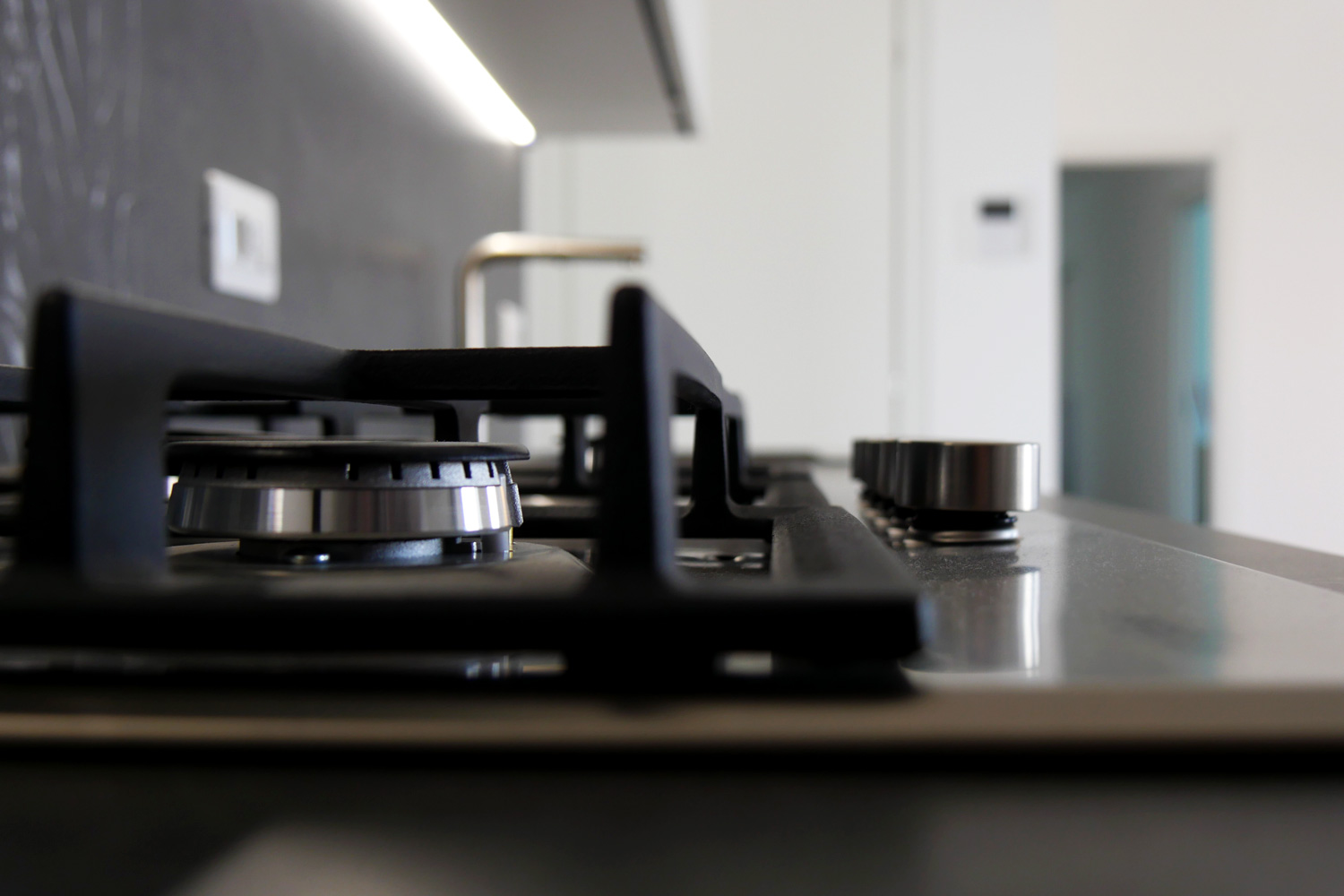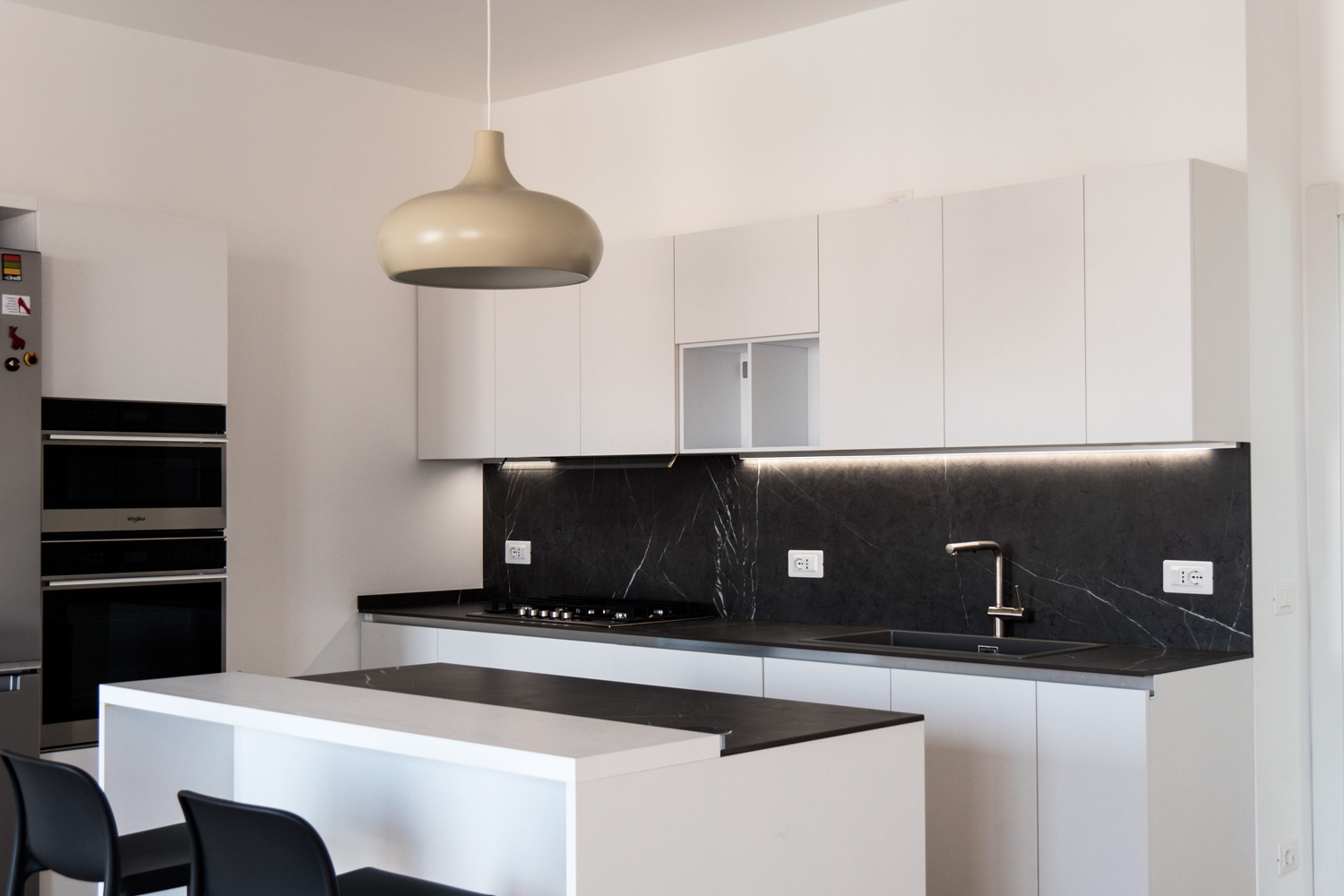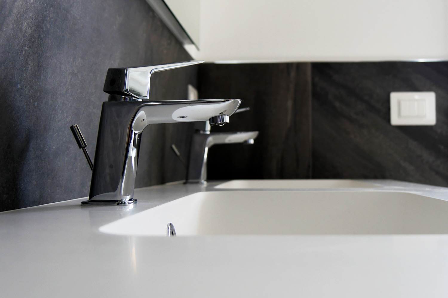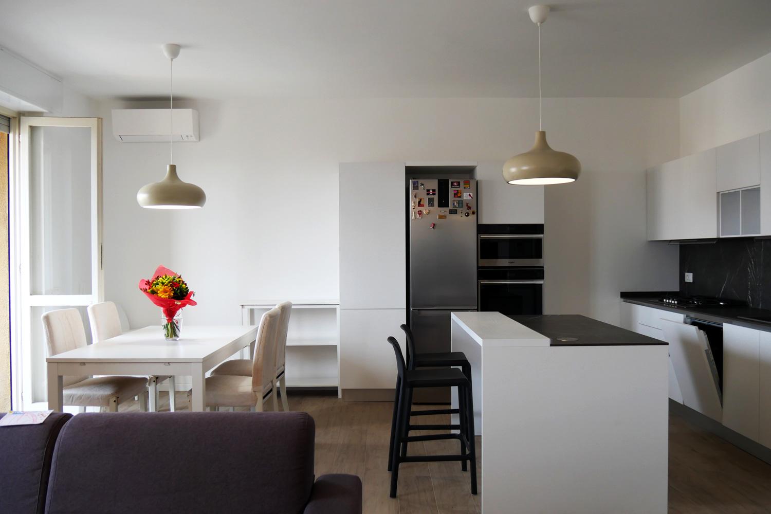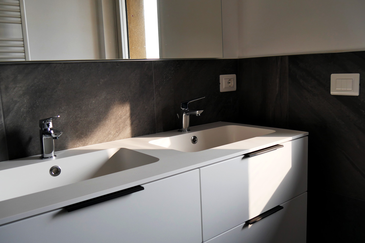 In questa operazione abbiamo fuso due unità immobiliari in un unico appartamento di 120 mq, realizzando un ampio soggiorno doppio e centralizzando l’impiantistica elettrica, protetta da magnetotermici differenziali, in un nuovo quadro a 24 moduli. I due videocitofoni sono stati integrati in un unico sistema. Sono stati realizzati ex novo gli impianti idrotermosanitari dei due bagni con tubazioni multistrato sotto traccia e spostata la cucina in una nuova posizione, predisponendo tutti gli impianti necessari. È stata prevista la motorizzazione delle tapparelle e installato un nuovo impianto di climatizzazione estiva con fornitura, montaggio e avviamento di tre nuove macchine Daikin. Le finiture includono sanitari Galassia, rubinetteria Mamoli, pavimentazioni di Ceramica del Conca e rivestimenti Valsecchia per i bagni. Oltre all’intero progetto abbiamo seguito per il cliente tutta la pratica CILA.