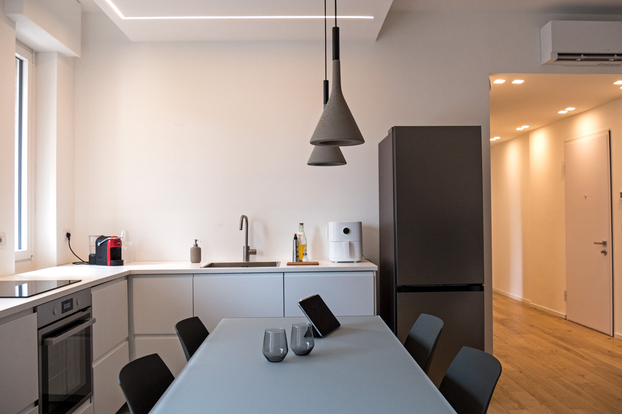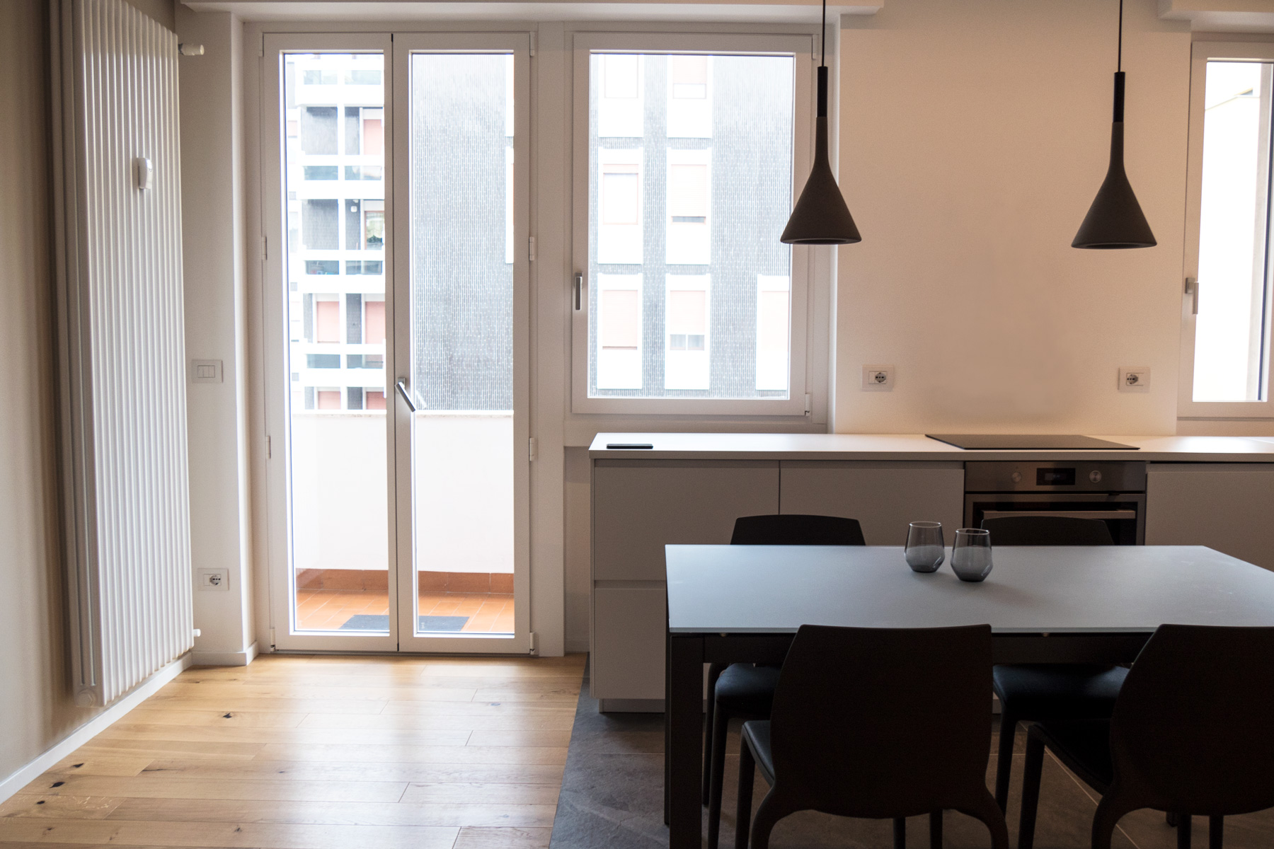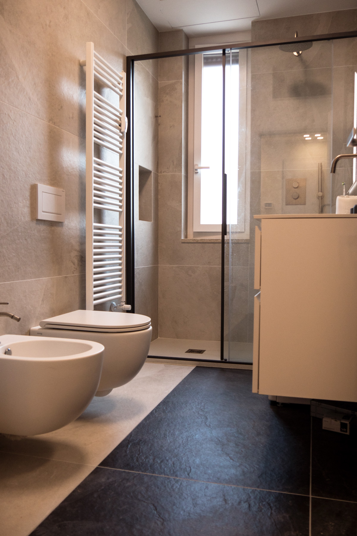 In zona Arco della Pace, abbiamo eseguito una ristrutturazione completa con modifica degli spazi interni e realizzazione della nuova impiantistica. Su richiesta della committenza è stato evitato l’utilizzo dell’utenza gas, installando un impianto a pompa di calore per la produzione di acqua calda sanitaria, mentre nella zona living è stato realizzato un controsoffitto con illuminazione LED dimmerabile. È stato posato parquet in tutto l’appartamento, mentre nel bagno sono state utilizzate piastrelle Marazzi Mystone Ardesia 75x150 cm, sanitari sospesi Ceramica Galassia Dream e radiatori Zehnder Charleston.
