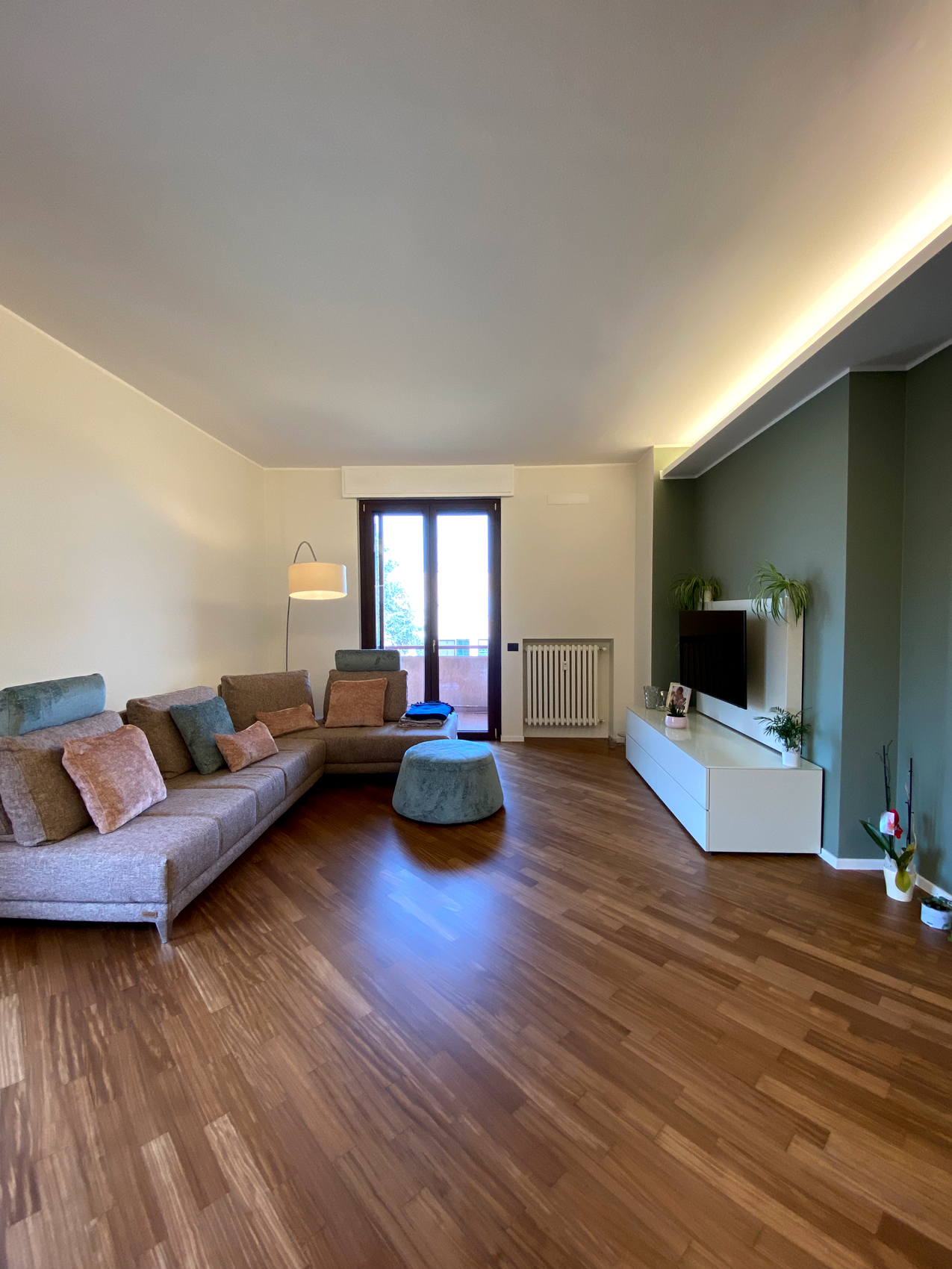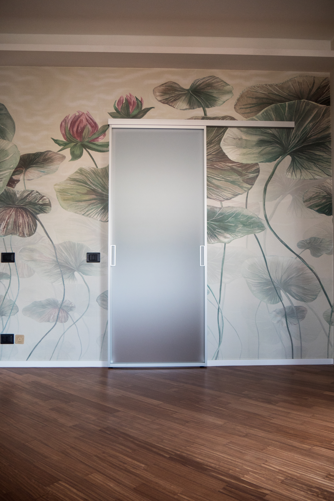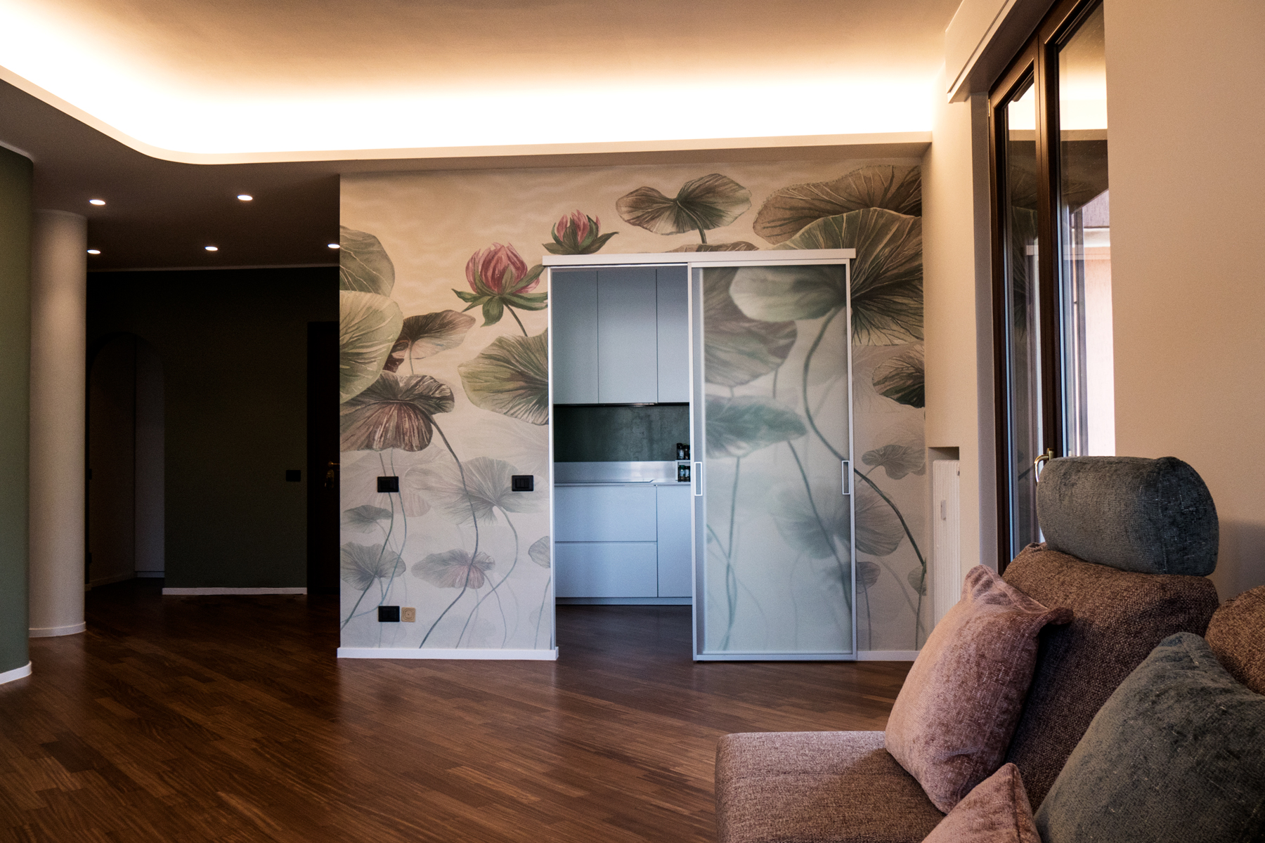 L’intervento che abbiamo effettuato in questo quadrilocale ha previsto la completa revisione della disposizione degli spazi interni, con demolizione delle pareti esistenti e realizzazione di nuove partizioni in gasbeton. È stata realizzata integralmente la nuova impiantistica idrotermosanitaria ed elettrica, con motorizzazione di tutte le tapparelle e posa di nuovi sanitari e ceramiche nei bagni, ed è stato inoltre realizzato un controsoffitto in cartongesso con faretti integrati. La scelta del cliente di rivestire le pareti della cucina, affacciata sul salone, con carta da parati a motivo floreale ha introdotto un elemento distintivo, valorizzato da tinteggiature coordinate che hanno esaltato sia la carta da parati sia il parquet.