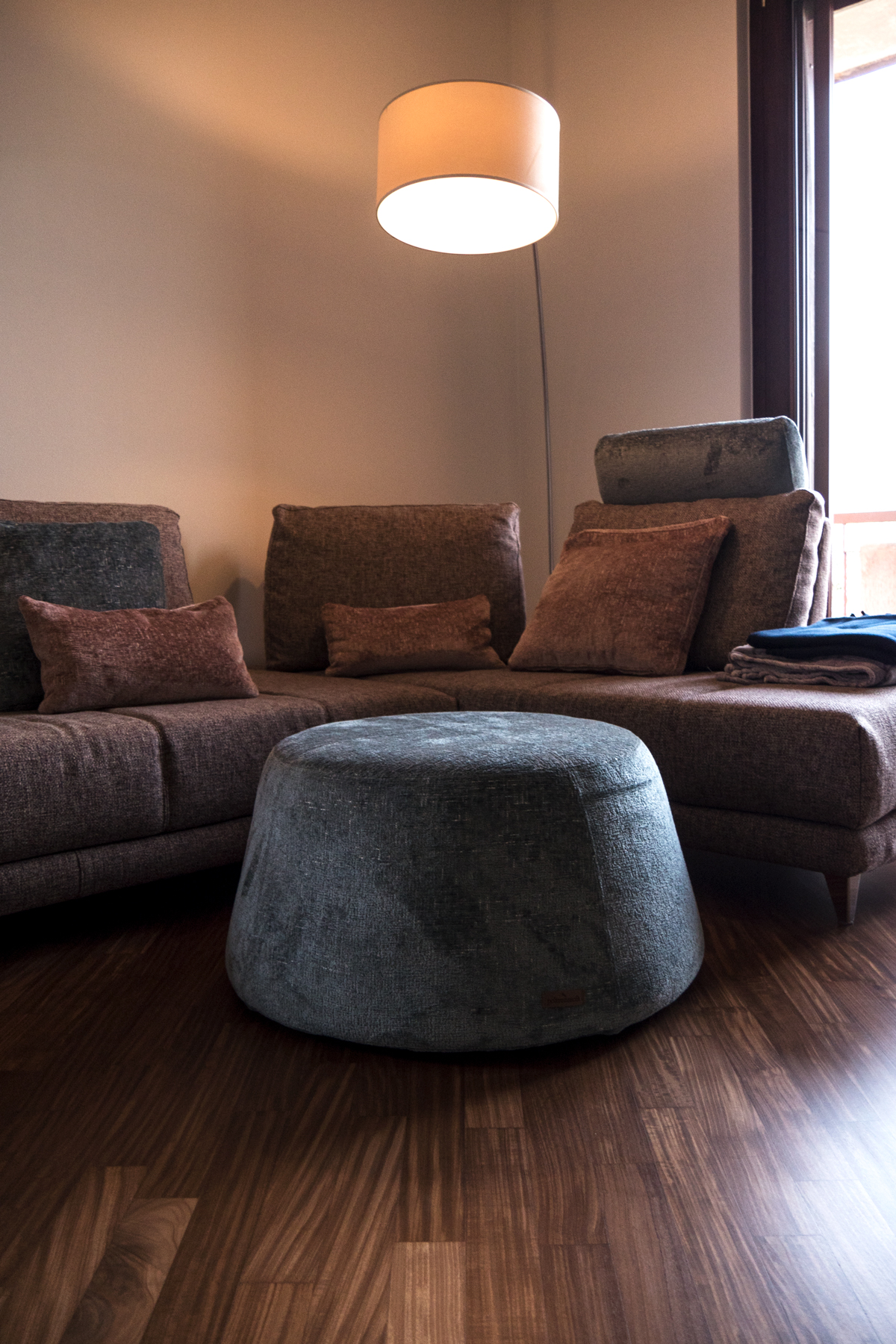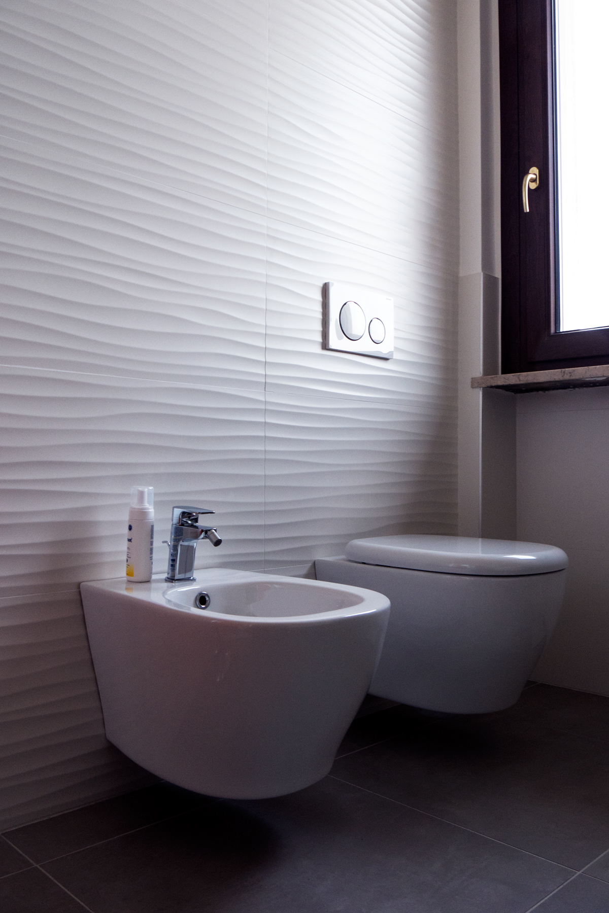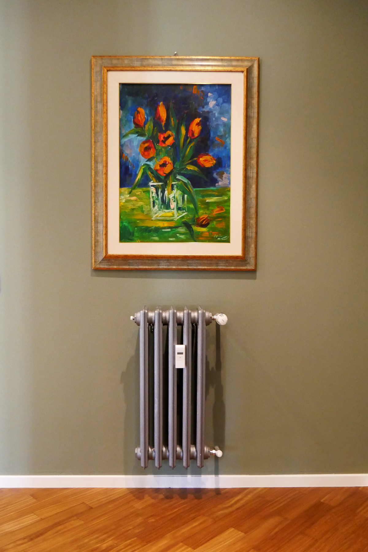 L’intervento che abbiamo effettuato in questo quadrilocale ha previsto la completa revisione della disposizione degli spazi interni, con demolizione delle pareti esistenti e realizzazione di nuove partizioni in gasbeton. È stata realizzata integralmente la nuova impiantistica idrotermosanitaria ed elettrica, con motorizzazione di tutte le tapparelle e posa di nuovi sanitari e ceramiche nei bagni, ed è stato inoltre realizzato un controsoffitto in cartongesso con faretti integrati. La scelta del cliente di rivestire le pareti della cucina, affacciata sul salone, con carta da parati a motivo floreale ha introdotto un elemento distintivo, valorizzato da tinteggiature coordinate che hanno esaltato sia la carta da parati sia il parquet.